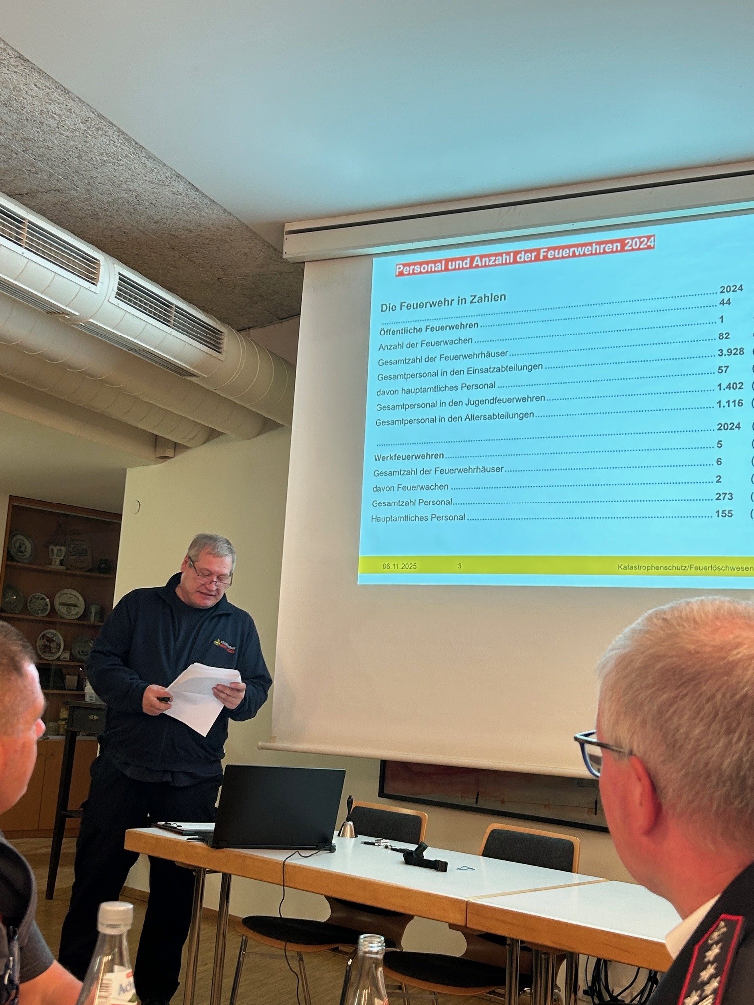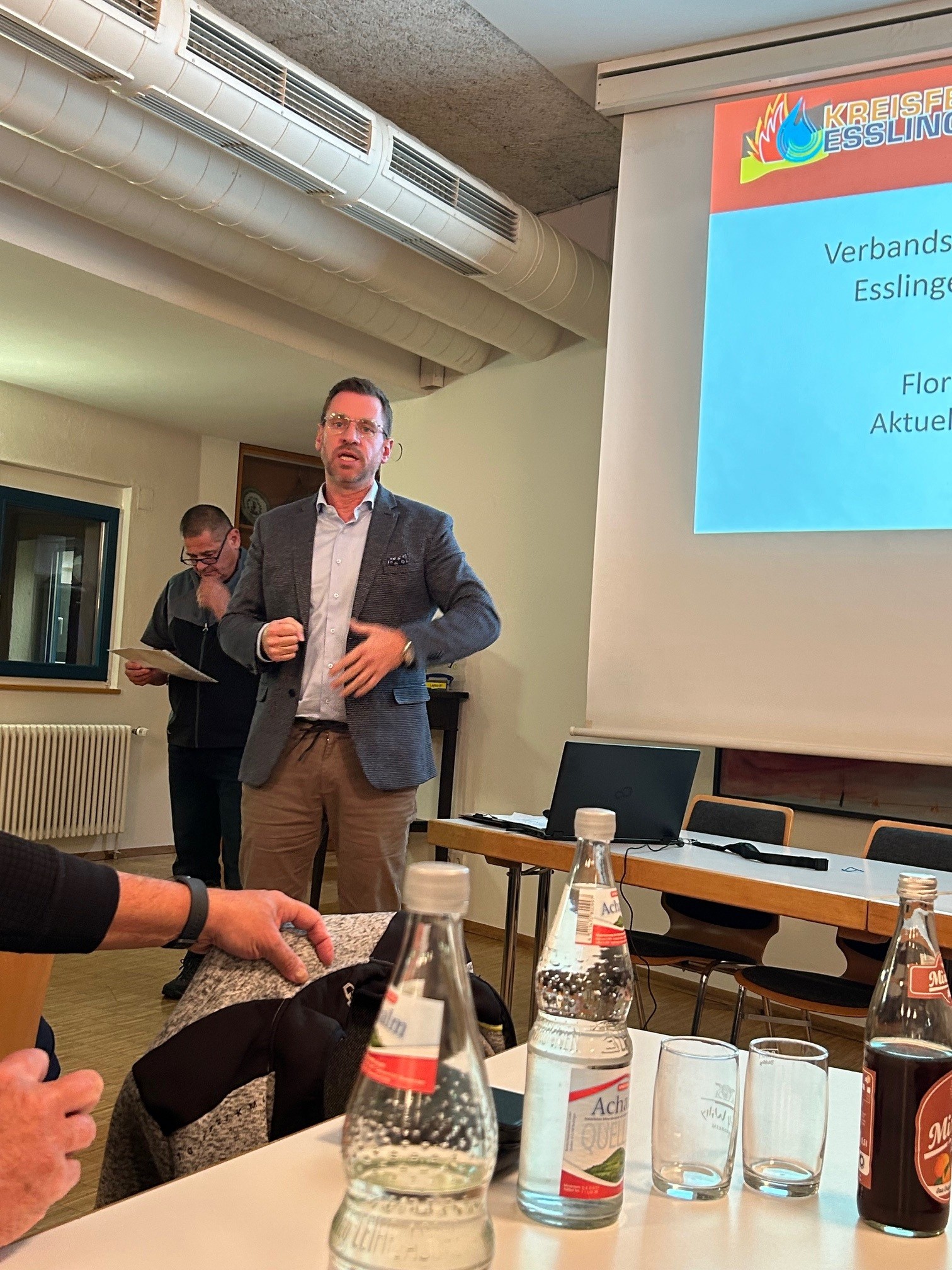 Punkt 3 durfte Ralf Bader stellvertretend für KBM Guido Kenner in seiner Präsentation wissenswertes und Berichte 2024 vom LRA erbringen. Ralf erwähnte Lobenswerte Zahlen in Form von steigende Zahlen in den Einsatzabteilungen sowie Jugendfeuerwehren, allerdings auch steigende Zahlen bei Technischen Hilfeleistungen. Erwähnte größere Einsätze z.B. Dachstuhlbrand Aichtal- Neuenhaus, Unterensingen. Weiter erwähnte Ralf die „neue“ Atemschutzübungsanlage der FF Kirchheim/ Teck und 2 neue Einsatzfahrzeuge, der GW- Mess und ein Hochwasserschutzanhänger, zum Schluss übermittelte Ralf Grüße vom KBM Guido Kenner.