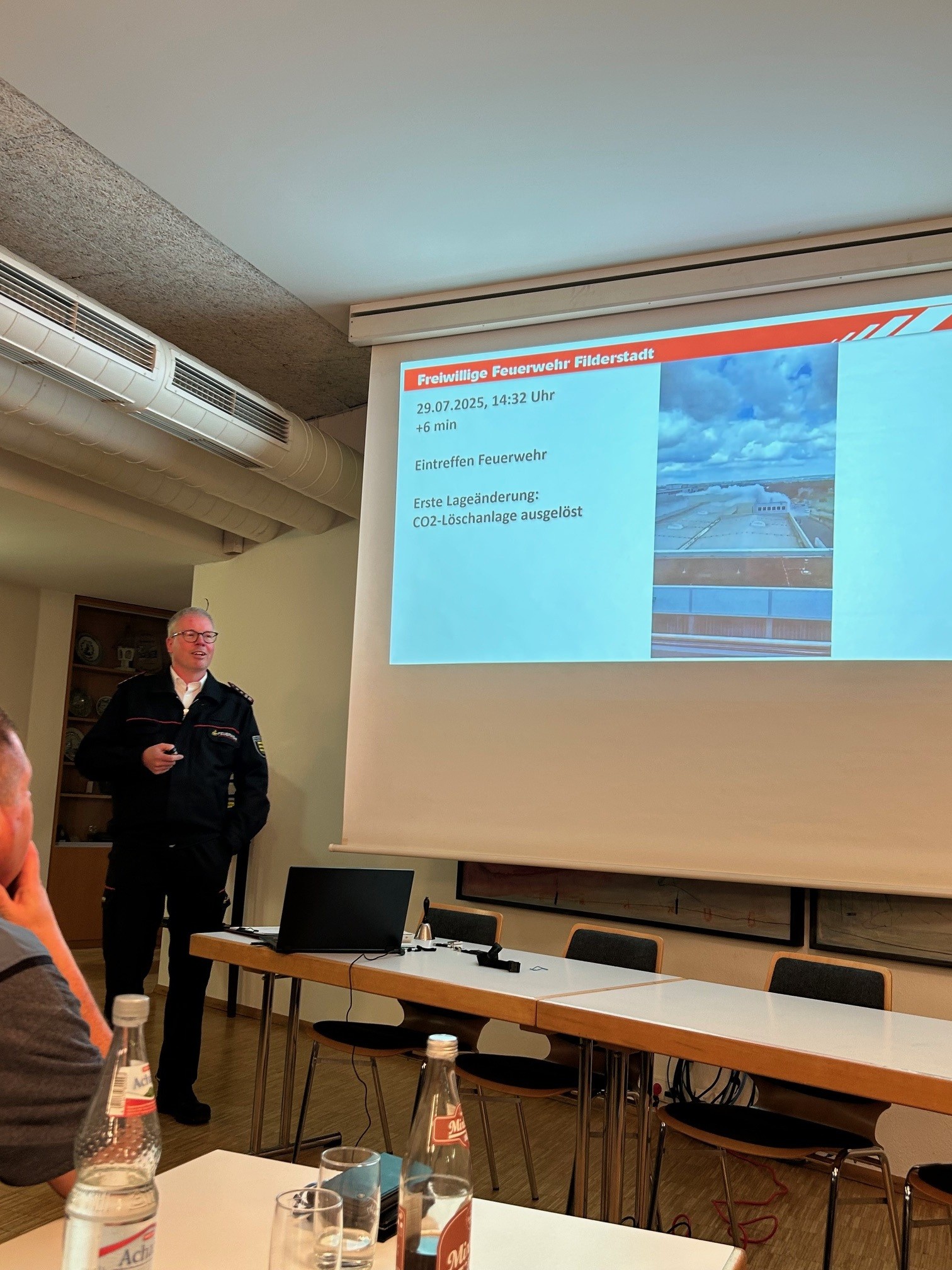 Zum Punkt 4 Gefahrguteinsatz der Stufe 3 berichtete der eingeladene Stadtbrandmeister der FF Filderstadt Jochen Thorns. Jochen berichtete hochinteressant in seiner Präsentation über einen Anfänglichen normalen BMA Einsatz, der nach dem Eintreffen der Feuerwehr die 1. Lageänderung ergab, nämlich CO2- Löschanlage ausgelöst. Dieser Einsatz entwickelte sich dann nach weiteren 4 Lageänderungen und kleinen Problemen in der Kommunikation zum Gefahrguteinsatz der Stufe 3 mit vielen Gefahrgut- Einsatzkräften, und einer Quarzsandbeschaffung bis zum abstreuen des Gefahrgutstoffes. Einsatzdauer: 13,5 Stunden